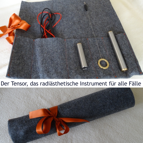 aus Edelstahl gefertigtes Handstück, ca. 25cm langer Federdraht mit Messingring, zweites Handstück, zwei 1m lange Kabel mit Verbindungssteckern und einer Abtastspitze, handgenähte Filztasche